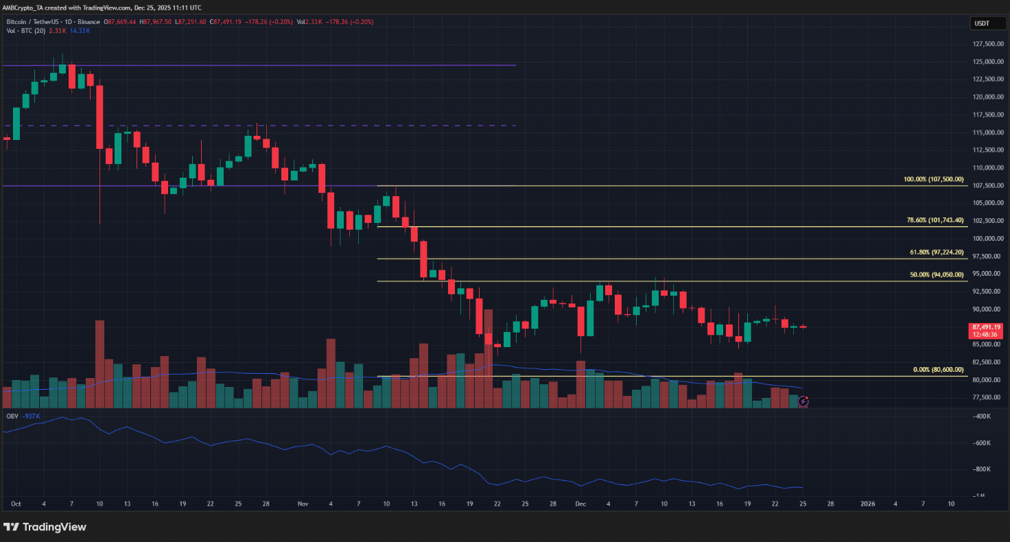Trên khung thời gian 1 ngày, hành động giá trong tháng 12 thiếu xu hướng rõ ràng, với cấu trúc ngắn hạn nghiêng về giảm. Điều này làm tăng khả năng giá quay lại vùng thanh khoản quanh $84.000.