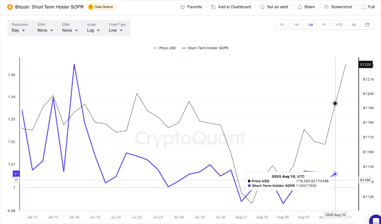 Theo dữ liệu từ CryptoQuant, chỉ số Short-Term Holder Spent Output Profit Ratio (SOPR) đo lường liệu BTC được chuyển on-chain đang được bán ra đang có lãi hay lỗ. Khi SOPR của nhóm nhà đầu tư ngắn hạn tăng cao, điều này thường cho thấy hoạt động chốt lời mạnh, báo hiệu đỉnh cục bộ.