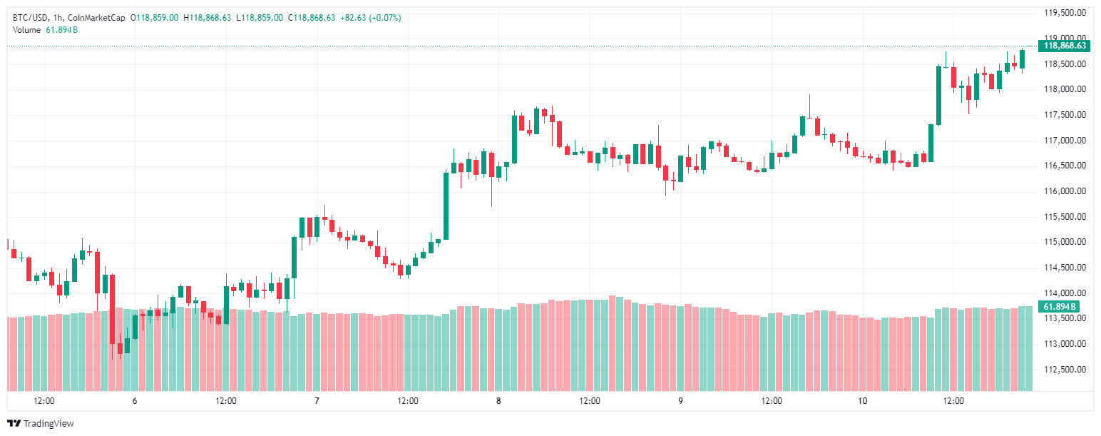 Dữ liệu từ TradingView cho thấy giá BTC đã đạt 118.760 đô la, thiết lập mức đỉnh mới trong tháng 8.