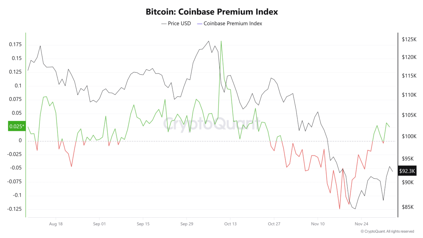 Bên cạnh đó, Chỉ số Coinbase Premium đã chuyển sang mức dương vào ngày 28/11 và duy trì trạng thái tích cực kể từ đó. Điều này phản ánh nhu cầu mua trực tiếp (spot demand) gia tăng từ các nhà đầu tư Mỹ, đặc biệt thông qua sự chênh lệch phần trăm giữa cặp BTC-USD trên Coinbase và BTC-USDT trên Binance.