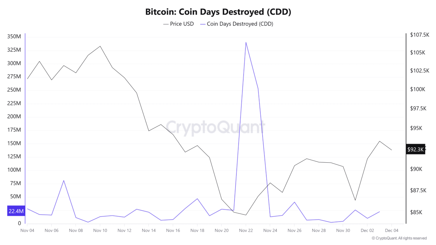 Chỉ số Coin Days Destroyed phản ánh tâm lý và hành vi của holder dài hạn. Chỉ số này được tính dựa trên số lượng UTXO bị “hủy”, và những đột biến trên chỉ số này thường cho thấy các nhà đầu tư lâu năm đang di chuyển tài sản, đôi khi báo hiệu các đợt chốt lời sắp xảy ra.