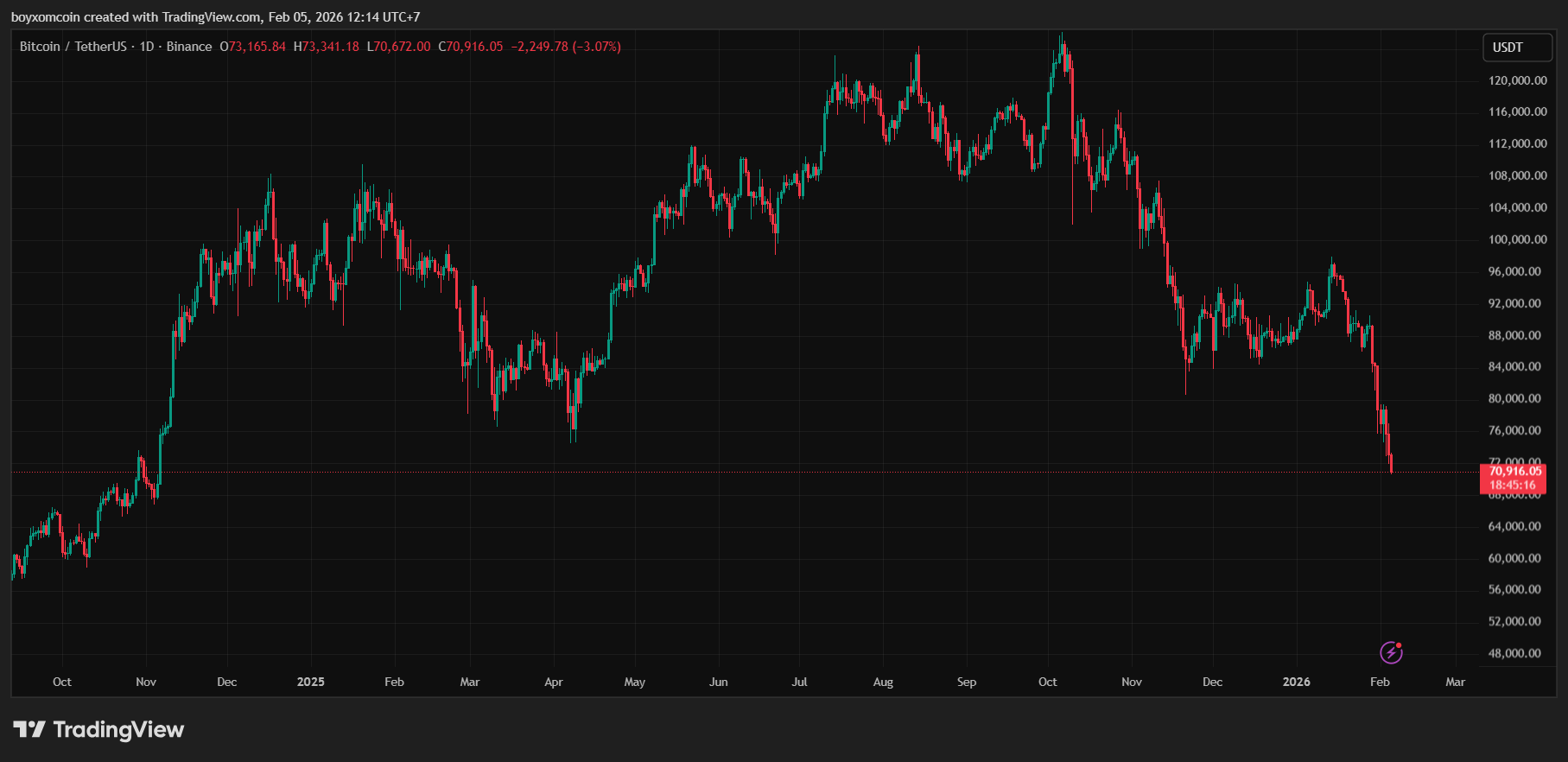 Tiền điện tử lớn nhất thế giới mất 7,2% chỉ trong 24 giờ, rơi về 70.916 USD vào trưa thứ Năm — đánh dấu mức giá thấp nhất trong gần bốn tháng, theo dữ liệu từ TradingView. Đà suy yếu lan rộng sang các altcoin lớn, với Ethereum giảm 7,8%, lùi về 2.091 USD.