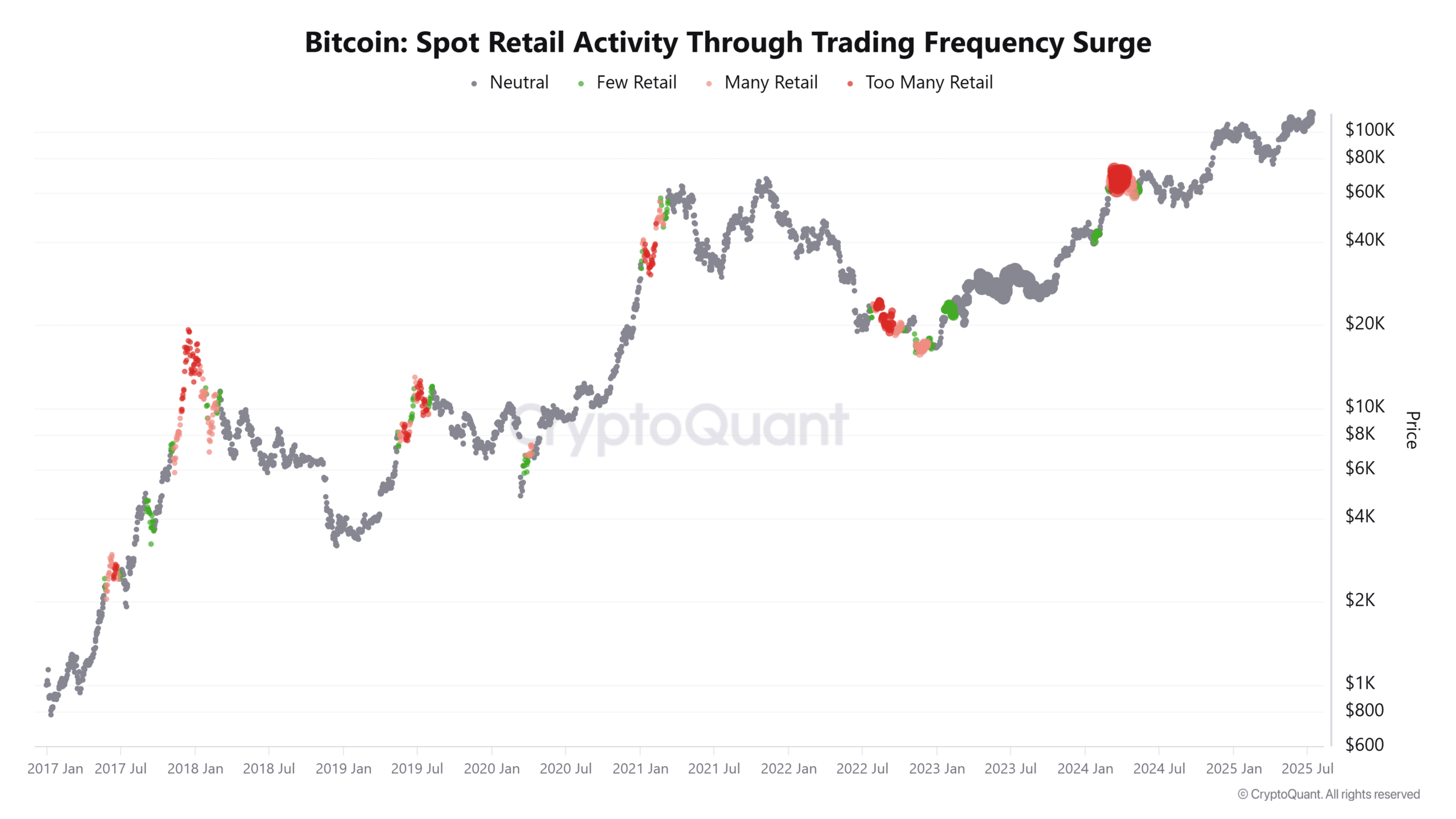Một trong những chỉ báo quan trọng của thị trường tiền điện tử là hoạt động bán lẻ. Theo dữ liệu từ CryptoQuant, hoạt động giao dịch Bitcoin giao ngay của các nhà đầu tư bán lẻ vẫn chưa ghi nhận dấu hiệu tăng vọt. Mặc dù sự quan tâm đối với Bitcoin có thể gia tăng, nhưng mức độ tham gia của các nhà đầu tư nhỏ lẻ vẫn chưa cao. Chỉ số hoạt động bán lẻ giao ngay này đã không chứng kiến một đợt tăng trưởng mạnh mẽ kể từ tháng 3 năm 2024, điều này phản ánh một sự thiếu hụt trong lòng tin của nhà đầu tư nhỏ lẻ.