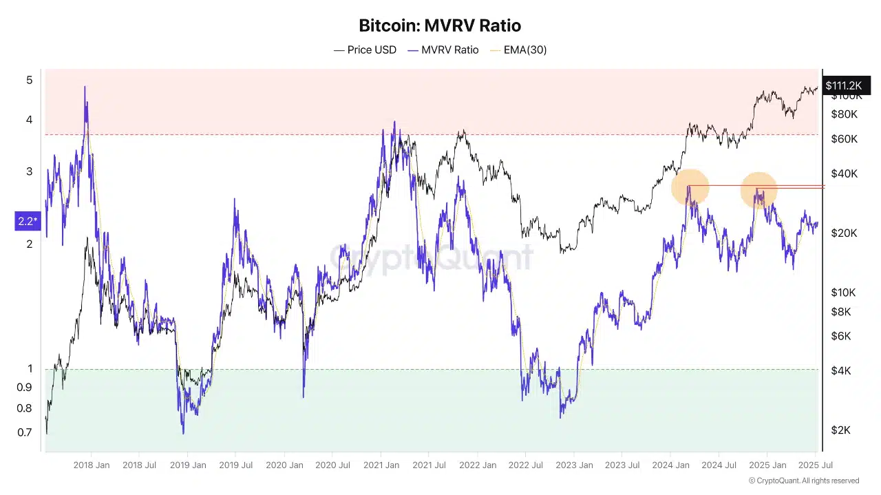 Trong những đợt bùng nổ thị trường trước, tỷ lệ MVRV của Bitcoin đã vượt qua mức 2,7 vào các tháng 3 và 12 năm 2024. Tuy nhiên, vào ngày 11 tháng 7 vừa qua, chỉ số này dao động quanh mức 2,2, cho thấy thị trường hiện tại đang duy trì một tình trạng ổn định và lành mạnh hơn. Đây là một tín hiệu rõ ràng rằng thị trường chưa bị “thổi phồng” quá mức, trái ngược với các đỉnh của những chu kỳ trước.