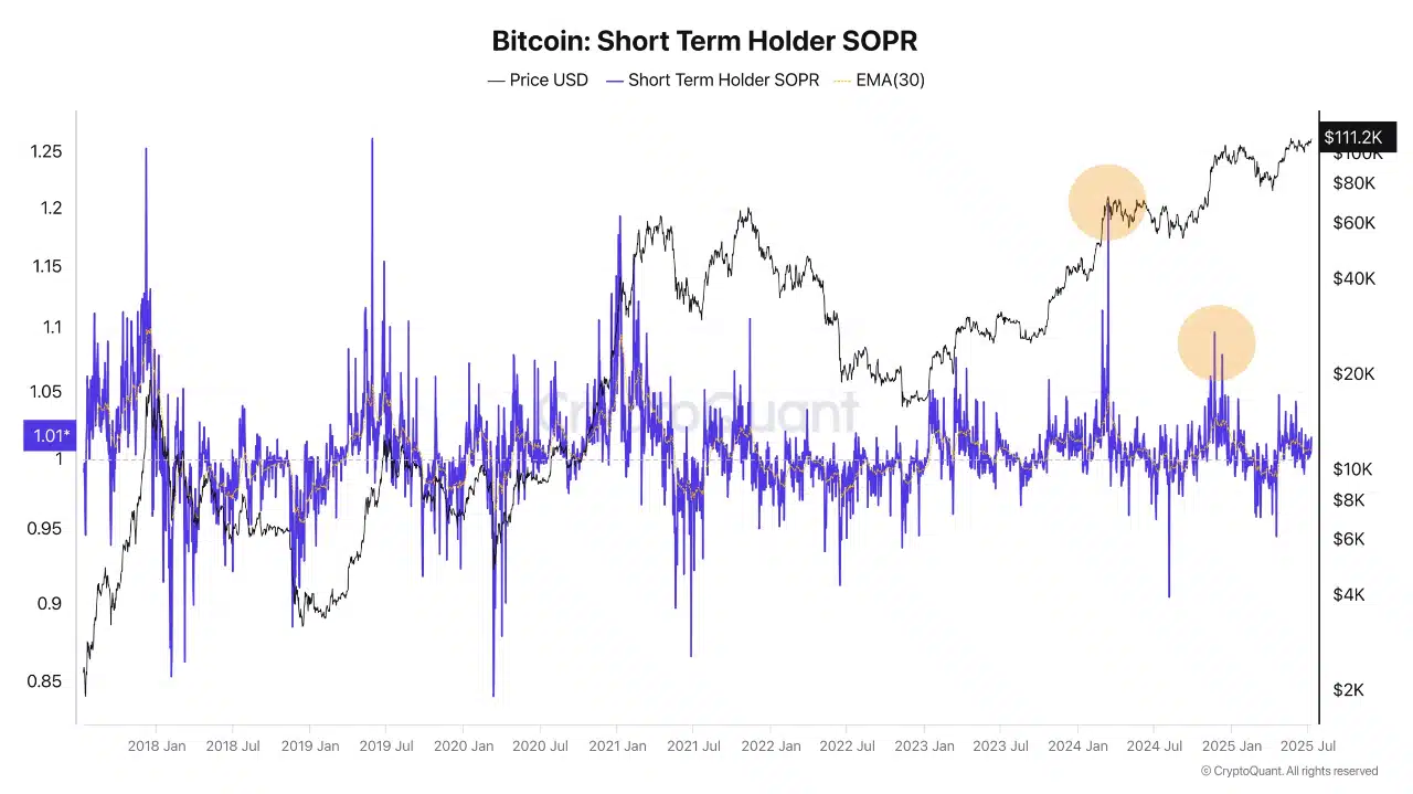 Một chỉ báo quan trọng khác là phân tích UTXO Age Bands, giúp theo dõi thời gian mà mỗi Bitcoin chưa được chi tiêu. Dữ liệu hiện tại cho thấy khoảng 15% nguồn cung Bitcoin thuộc về các hodler ngắn hạn (STH) – những ví đang giữ Bitcoin dưới một tháng. So với các chu kỳ trước, tỷ lệ này chỉ bằng một nửa so với mức gần 30% từng ghi nhận ở các đỉnh của các chu kỳ tăng trưởng mạnh.