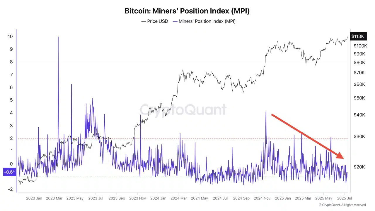 Một yếu tố quan trọng nữa hỗ trợ cho nhận định rằng đợt tăng giá Bitcoin chưa kết thúc là hành động của các thợ khai thác. Theo dữ liệu từ CryptoQuant, chỉ số vị thế của thợ đào Bitcoin đã có xu hướng giảm kể từ tháng 11 năm 2024. Điều này cho thấy rằng áp lực bán từ các thợ đào đang dần giảm đi, phản ánh rằng họ ít có xu hướng bán ra Bitcoin trong giai đoạn này.
