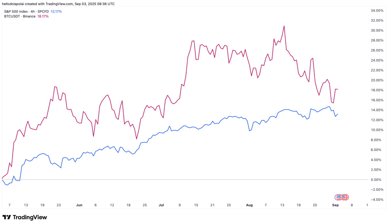 Bitcoin (BTC) và chỉ số S&P 500 đang cho thấy sự tách rời ngày càng rõ nét tại thời điểm viết bài. Nếu như trong quá khứ, hai loại tài sản này thường vận động song hành, thì biểu đồ hàng ngày mới nhất lại phản ánh một xu hướng trái ngược.