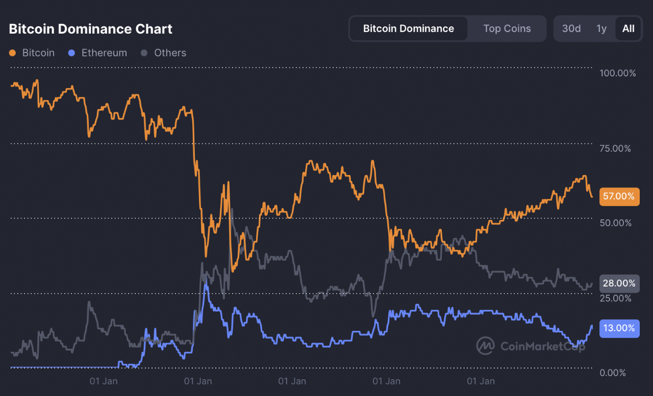 Theo CoinMarketCap, Tỷ lệ thống trị của Bitcoin (BTC.D) – đo lường thị phần của Bitcoin so với toàn bộ thị trường tiền điện tử – đã giảm 3,43% trong 24 giờ qua. Ethereum (ETH) chiếm phần lớn thanh khoản đó, với mức tăng 2,17%.