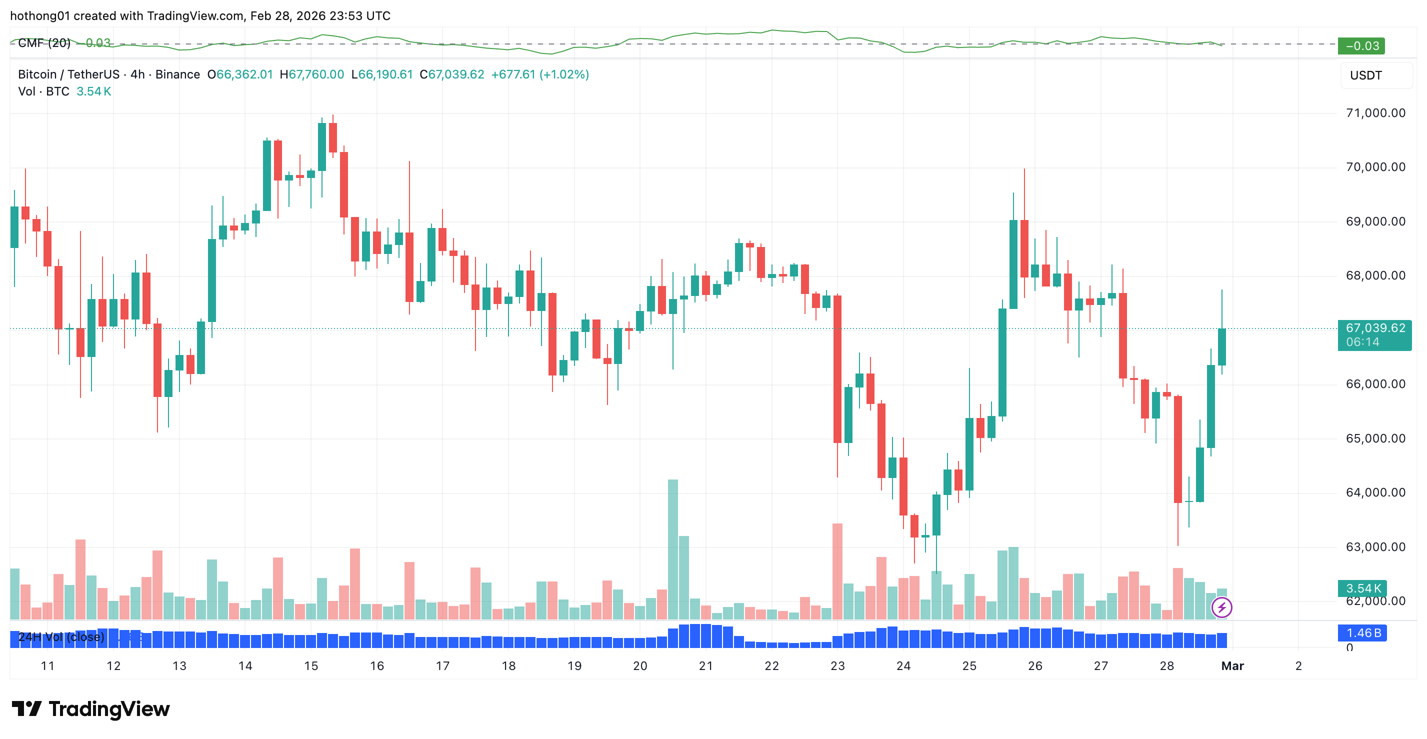 Do thị trường crypto là lĩnh vực tài chính hiếm hoi vẫn giao dịch trong cuối tuần, biến động giá diễn ra đặc biệt mạnh khi các sự kiện địa chính trị liên tục cập nhật. Sau các đợt không kích đầu tiên, Bitcoin giảm nhanh từ 66.000 USD xuống 63.000 USD chỉ trong vài phút, kéo theo đà lao dốc của các altcoin. Tuy nhiên, giá sau đó phục hồi và bật lên 67.000 USD sau khi xuất hiện các báo cáo về cái chết của ông Khamenei.