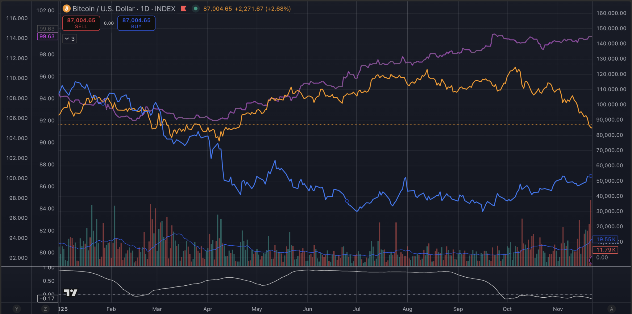 | Level corr | BTC vs DXY | Full sample | −0,58 | 203 ngày |