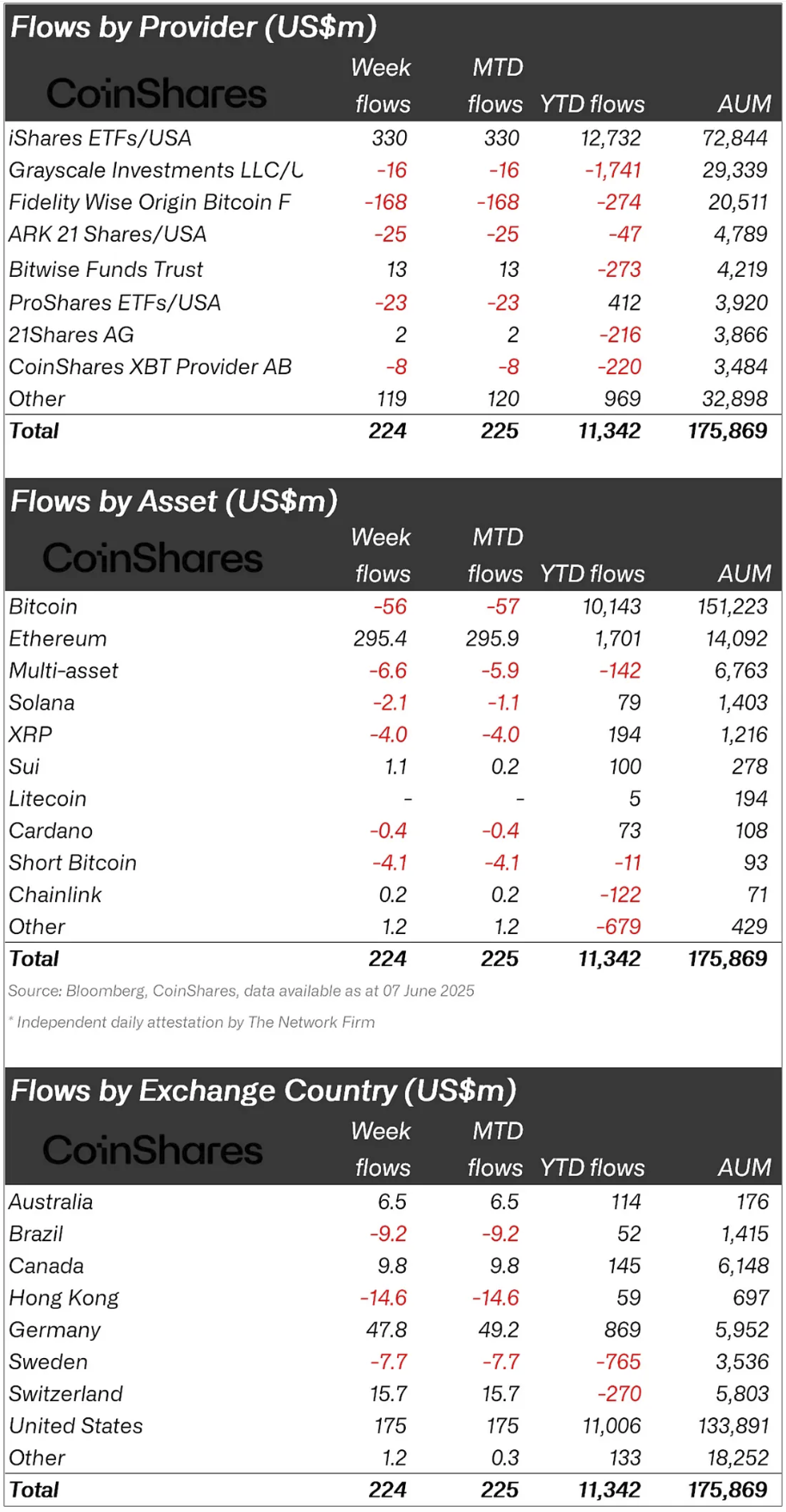 Dòng tiền ròng chảy vào được ghi nhận trên phạm vi toàn cầu, trong đó dẫn đầu là Hoa Kỳ với 175 triệu đô la, theo sau là Đức (47,8 triệu), Thụy Sĩ (15,7 triệu), Canada (9,8 triệu) và Úc (6,5 triệu). Ở chiều ngược lại, hai thị trường ghi nhận dòng tiền rút ròng là Brazil (9,2 triệu đô la) và Hồng Kông (14,6 triệu đô la), kết thúc chuỗi dòng tiền vào kỷ lục trước đó tại đặc khu này.