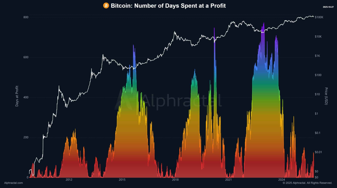 Theo dữ liệu từ Alphractal, Bitcoin đã duy trì gần nữa năm trên mốc 100.000 USD với mức điều chỉnh tối thiểu – trở thành giai đoạn duy trì lợi nhuận dài nhất trong lịch sử tài sản này.