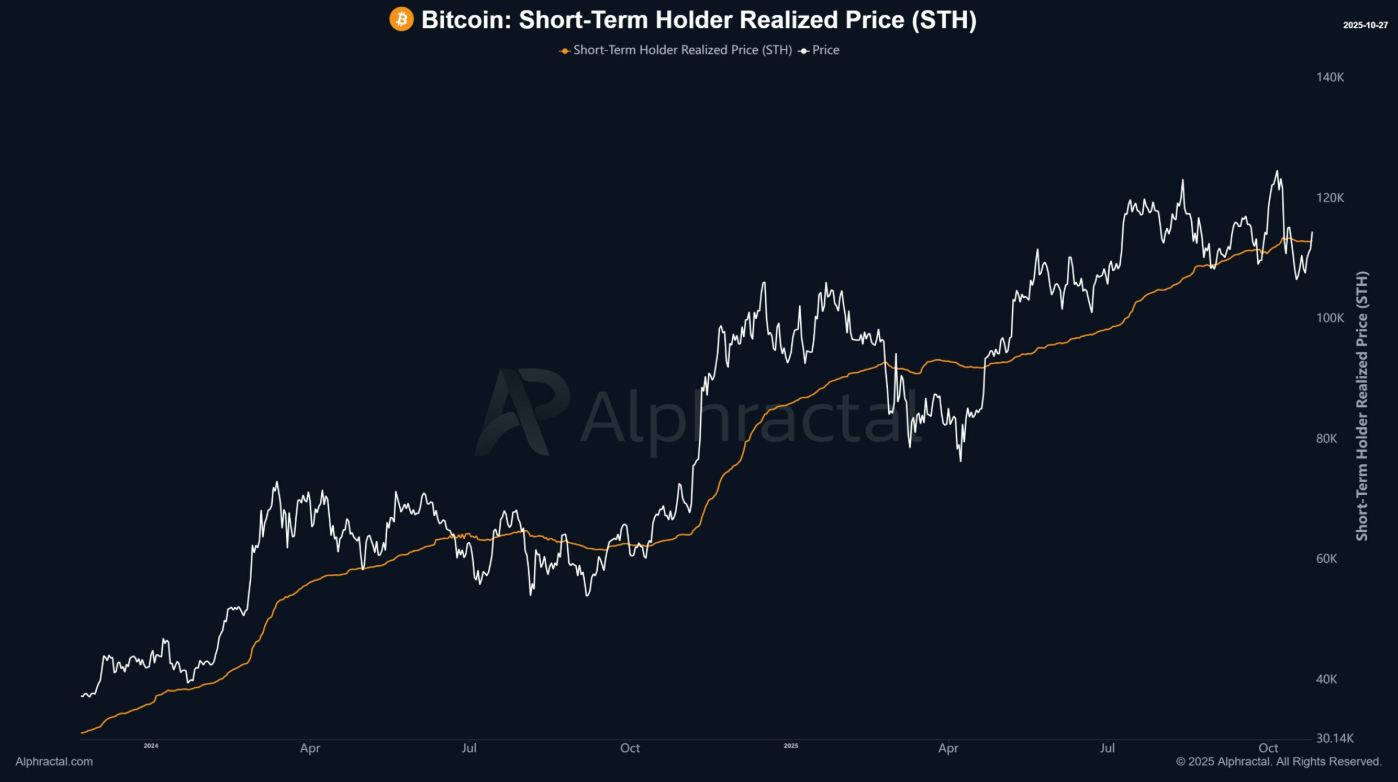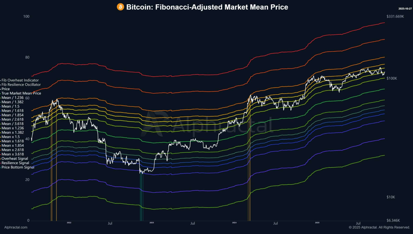 Theo Alphractal, Bitcoin đã vượt lên trên hai chỉ báo then chốt: Giá thực tế của nhà đầu tư ngắn hạn (STH Realized Price) và Đường giá trị trung bình thị trường thực (True Market Mean Price). Trong lịch sử, mỗi lần BTC bứt qua các ngưỡng này đều đánh dấu giai đoạn thị trường chuyển từ lưỡng lự sang tăng trưởng quyết đoán hơn.