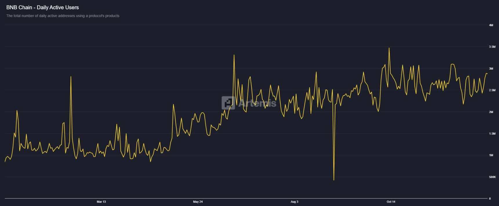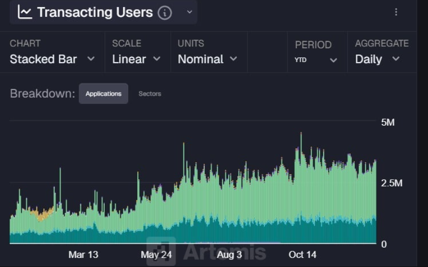 Đáng chú ý, làn sóng gia tăng mạnh mẽ số lượng holder đã trở thành động lực thúc đẩy rõ rệt hoạt động on-chain của toàn bộ mạng lưới. Cụ thể, số người dùng hoạt động hằng ngày đã tăng vọt từ khoảng 800.000 lên vùng 2,8–3 triệu, tương đương mức tăng ấn tượng gần 234%.