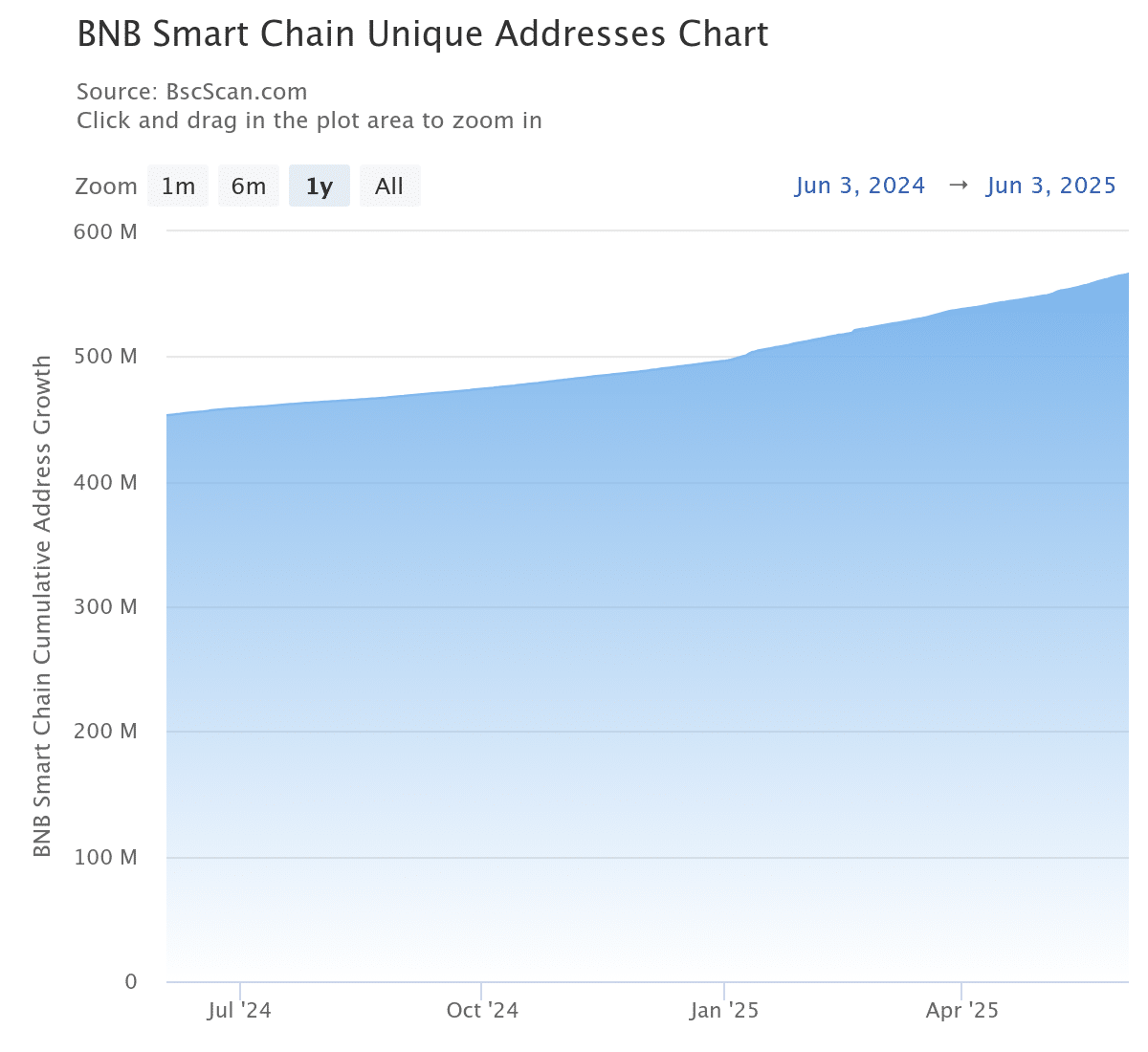Trong 24 giờ qua, BNB Smart Chain đã ghi nhận mức tăng đột biến về số lượng người dùng mới. Theo dữ liệu từ BSCscan, số lượng địa chỉ ví mới đã tăng tới 26%, nâng tổng số lên 589.657 địa chỉ – một chỉ dấu rõ ràng cho thấy sức hút ngày càng lớn của hệ sinh thái này.