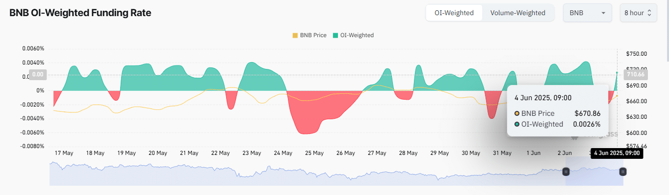 Sự tăng trưởng về người dùng cũng đồng thời phản ánh mức độ sử dụng ngày càng cao của BNB trên mạng lưới. Cụ thể, tổng phí giao dịch đã tăng 20,91%, đạt 933,23 BNB – mức cao nhất kể từ ngày 21/5. Diễn biến này trùng hợp với mức tăng 6,61% về giá BNB, đưa đồng coin này chạm mốc 691 USD. Nếu xu hướng trước đây tiếp tục lặp lại, BNB hoàn toàn có thể thiết lập đỉnh mới trong tuần này.