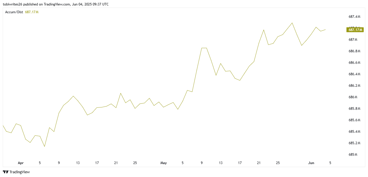Chỉ báo Tích lũy & Phân phối (A/D) hiện vẫn duy trì ở trạng thái tích cực – một dấu hiệu cho thấy dòng tiền đang tiếp tục đổ vào BNB thay vì bị rút ra. Sự tích lũy được xác nhận khi chỉ báo này có xu hướng đi lên hoặc ổn định trong vùng dương, và cả hai điều kiện này đều đang hiện diện trên biểu đồ giá của BNB.