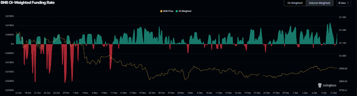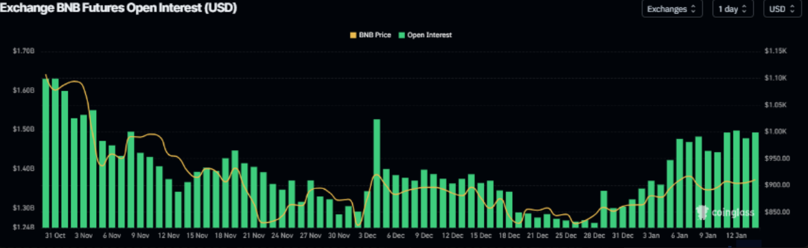 Theo số liệu từ CoinGlass, hợp đồng mở (OI) của BNB trên các sàn đã tăng mạnh lên 1,50 tỷ USD vào thứ Ba, từ mức 1,30 tỷ USD ghi nhận ngày 31/12 — đây cũng là mức cao nhất kể từ đầu tháng 12. Đà gia tăng của OI cho thấy dòng tiền mới đang liên tục đổ vào thị trường, phản ánh lực mua ngày càng mạnh và mở ra khả năng thúc đẩy giá BNB bứt phá trong ngắn hạn.