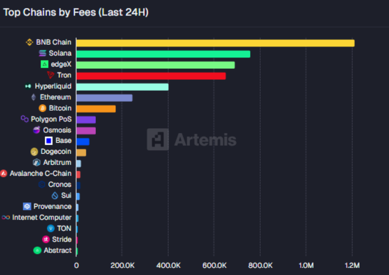 Theo số liệu từ Artemis Terminal, trong 24 giờ qua, phí giao dịch trên BNB Chain đã chạm mốc 1,2 triệu USD, vươn lên dẫn đầu so với nhiều mạng lưới khác như Solana hay edgeX. Diễn biến này phản ánh rõ sức hút ngày càng lớn của BNB Chain, khi dòng tiền và sự tham gia của giới giao dịch đang gia tăng mạnh mẽ, góp phần củng cố thanh khoản trên toàn hệ sinh thái.