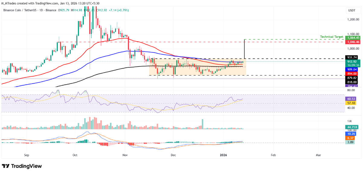 BNB đã dao động trong một kênh song song đi ngang kéo dài gần hai tháng, với biên độ giá được giới hạn trong khoảng 818 USD đến 931,74 USD. Trong giai đoạn này, cấu trúc giá đang dần được cải thiện khi BNB từng bước lấy lại các đường trung bình động quan trọng. Đáng chú ý, đường EMA 100 ngày quanh 909,04 USD hiện đóng vai trò là ngưỡng kháng cự gần nhất, trong khi EMA 50 ngày và EMA 200 ngày lần lượt tại 894 USD và 879,82 USD tiếp tục đóng vai trò nâng đỡ cho xu hướng ngắn và trung hạn. Tại thời điểm viết bài vào thứ Ba, giá BNB đang tiến sát vùng tích lũy phía trên của kênh.