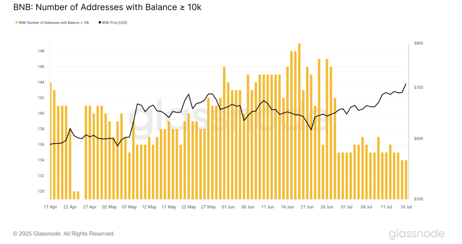Tuy nhiên, có một sự bất thường đáng chú ý: số lượng ví nắm giữ hơn 10.000 BNB đang giảm dần, và hiện đã chạm mức thấp nhất trong gần ba tháng. Trong khi các đồng tiền lớn khác như Solana đang chứng kiến sự tăng trưởng mạnh mẽ về số lượng ví, thì những người nắm giữ BNB lại có dấu hiệu rút lui. Điều này cho thấy các nhà đầu tư cá voi có thể đang cắt giảm sự tham gia của mình vào BNB, mặc dù đồng tiền này vẫn duy trì được sự ổn định và tính thanh khoản cao.