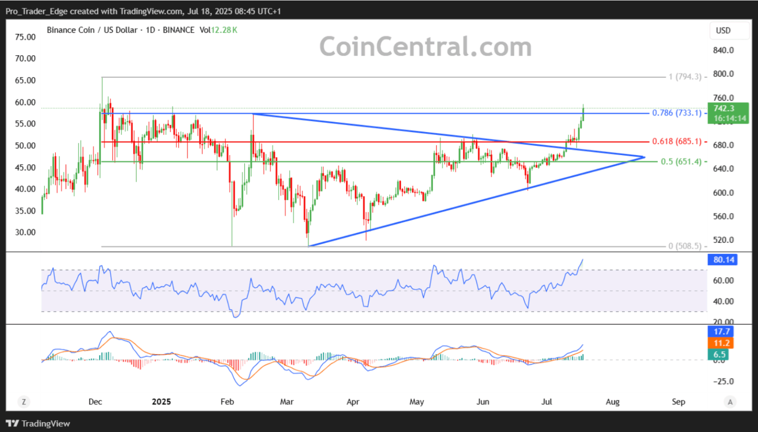 Hiện tại, BNB đang giao dịch ở mức 737,7 đô la. Trên biểu đồ kỹ thuật, động lực tăng giá có vẻ khá tích cực, khi giá vượt qua các đường trung bình động chính và chỉ báo MACD đang nhấp nháy tín hiệu tăng giá mạnh mẽ. Chỉ số RSI hiện đang ở mức 79,39, cho thấy BNB có thể đang hơi “quá mua”, nhưng vẫn chưa đạt mức quá mạnh để báo hiệu một sự đảo chiều rõ rệt.