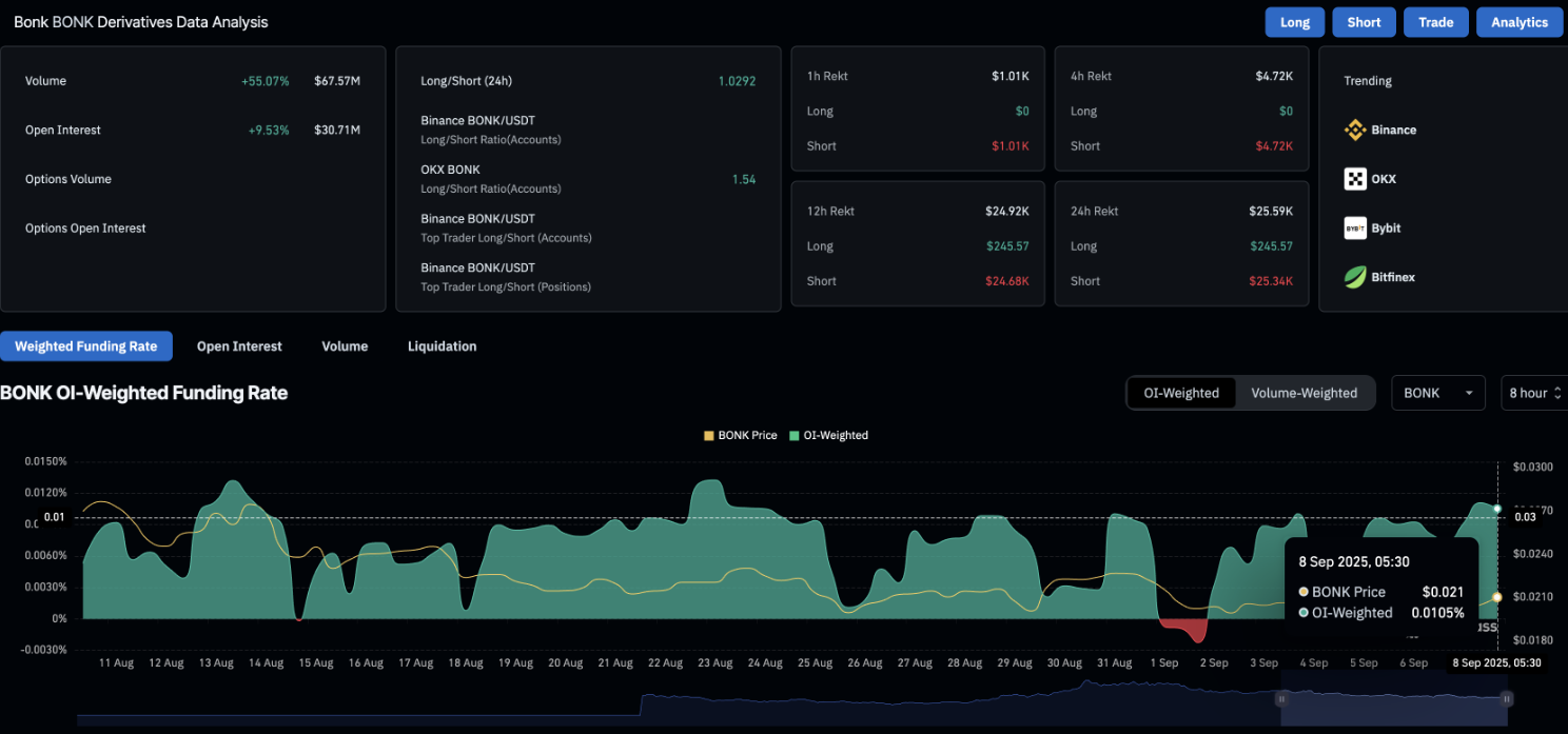 Theo dữ liệu từ CoinGlass, hợp đồng mở (OI) của BONK đã tăng 9,53% chỉ trong 24 giờ qua, đạt mức 30,71 triệu USD. Diễn biến này cho thấy dòng vốn mới đang chảy mạnh vào thị trường phái sinh của Bonk.