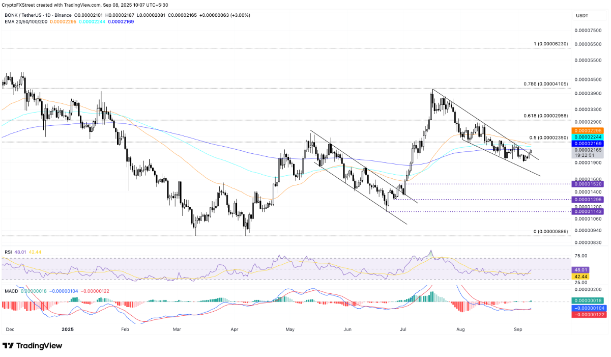 Tính đến chiều thứ Hai, BONK tiếp tục duy trì đà phục hồi khi tăng thêm 3%, nối dài mức tăng 5,58% của phiên trước đó. Meme coin lấy cảm hứng từ chó với cơ chế giảm phát này đã hoàn tất mô hình cái nêm giảm trên biểu đồ ngày và bứt phá đi lên, tiến sát đường EMA 200 ngày tại $0,00002169.