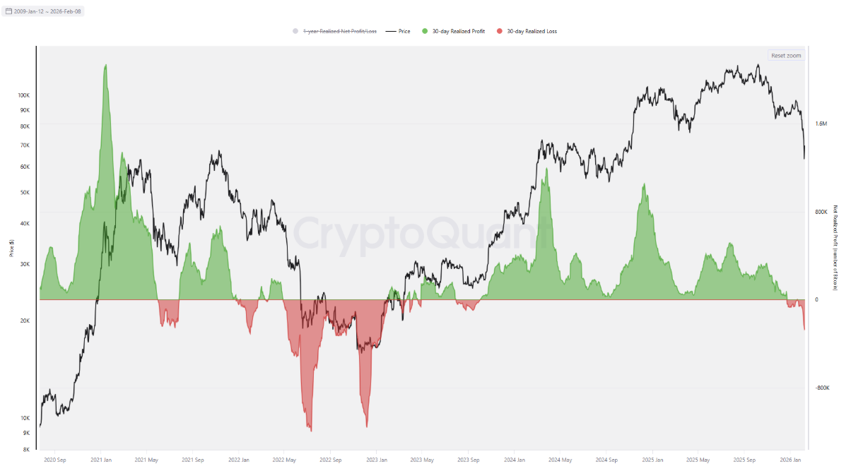 Dữ liệu từ CryptoQuant cho thấy bức tranh ngày càng u ám đối với nhà đầu tư Bitcoin, khi mức thua lỗ ròng liên tục phình to và gây áp lực nặng nề lên giá BTC. Kể từ ngày 20/1, chỉ báo này đã trượt sâu xuống vùng âm và không ngừng suy yếu, đạt mức lỗ lên tới 263.000 BTC vào Chủ nhật. Đáng chú ý, diễn biến hiện tại mang nhiều nét tương đồng với giai đoạn chuyển mình từ thị trường bò sang thị trường gấu 2021–2022: lợi nhuận thực hiện lập đỉnh vào tháng 1/2021, sau đó hình thành chuỗi đỉnh thấp dần trong suốt năm 2021, trước khi chính thức đảo chiều sang thua lỗ ròng ngay trước khi thị trường gấu năm 2022 khởi phát.