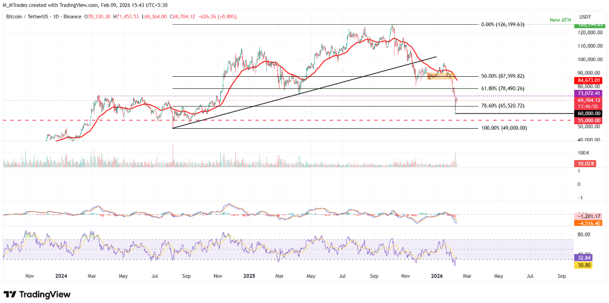 Trong trường hợp BTC không giữ được nhịp hồi và tiếp tục suy yếu, giá có nguy cơ trượt sâu hơn về vùng Fib thoái lui 78,6% — được đo từ đáy tháng 8/2024 tại 49.000 USD lên đỉnh lịch sử tháng 10/2025 ở 126.199 USD — tương ứng quanh mốc 65.520 USD.