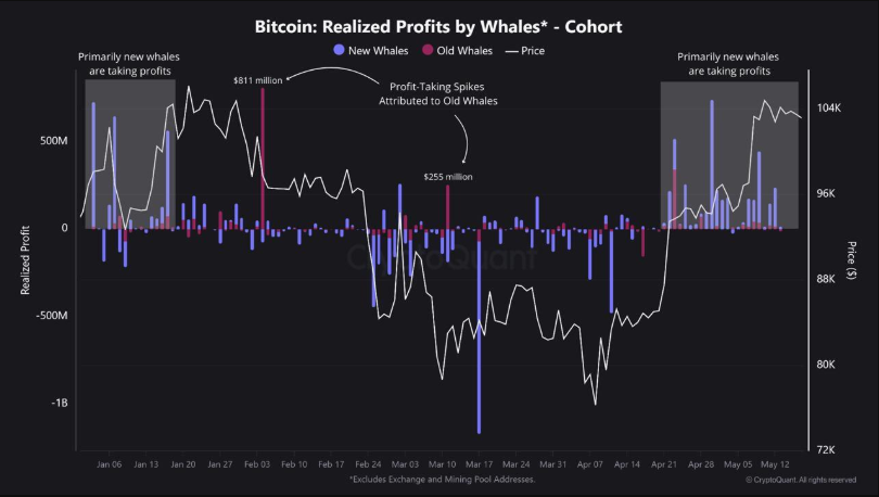 Ngoài ra, biểu đồ CryptoQuant sau đây phản ánh cách mà xu hướng này diễn ra trước khi BTC đạt mức ATH vào tuần trước. Các thanh màu xanh lam, đại diện cho những ví cá voi mới, chiếm ưu thế trong các đợt chốt lời (đường màu xám) kể từ cuối tháng 4.