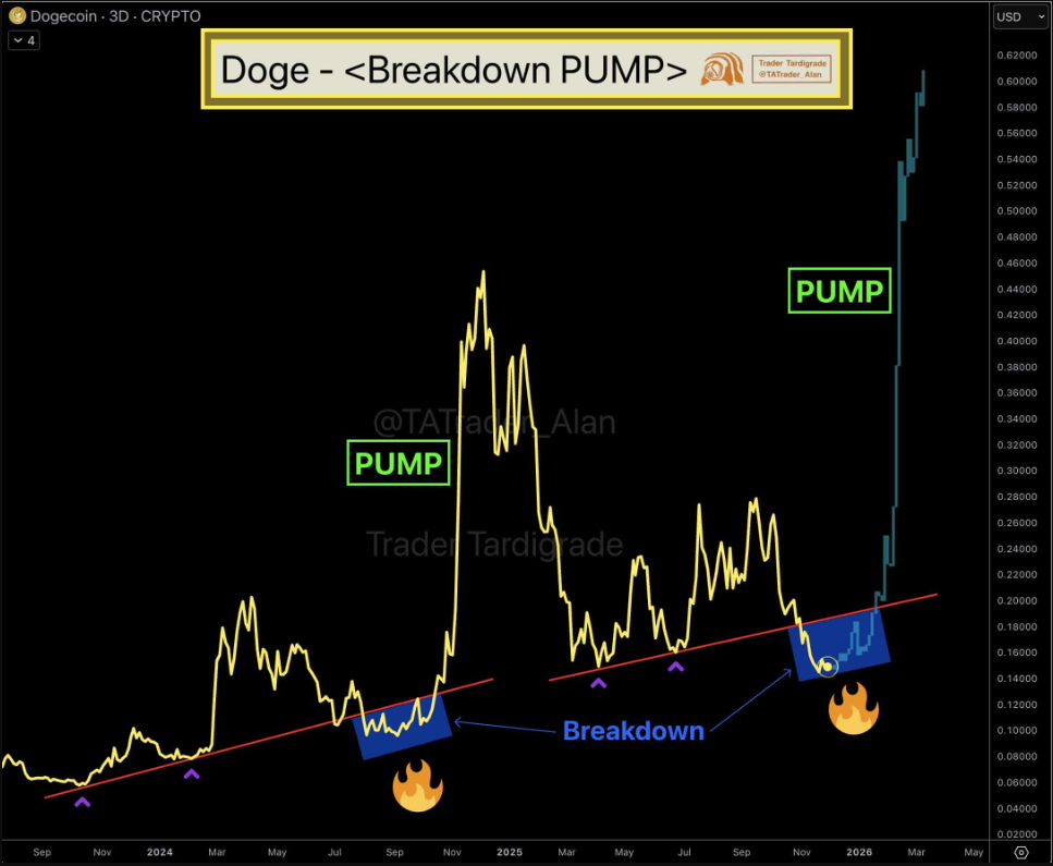 Trader Tardigrade, một nhà phân tích nổi tiếng trên X, nhận định rằng Dogecoin có khả năng bứt phá, thậm chí vượt mốc 0,60 USD. Hiện tượng này gợi nhớ đến đợt giảm trước đó, khi Dogecoin rơi xuống dưới mức hỗ trợ thứ hai, như biểu đồ minh họa.