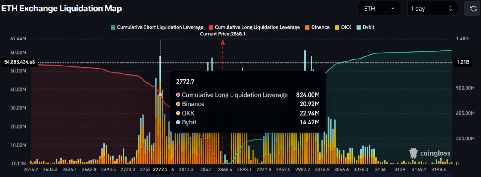 Dữ liệu từ CoinGlass chỉ ra rằng các ngưỡng thanh lý quan trọng của ETH hiện nằm tại 2.772,7 USD ở bên dưới và 2.990,5 USD ở bên trên. Đây đều là những vùng tập trung lượng lớn vị thế đòn bẩy, đồng nghĩa chỉ cần một nhịp biến động mạnh theo bất kỳ hướng nào cũng có thể kích hoạt một đợt biến động lớn trên toàn thị trường.