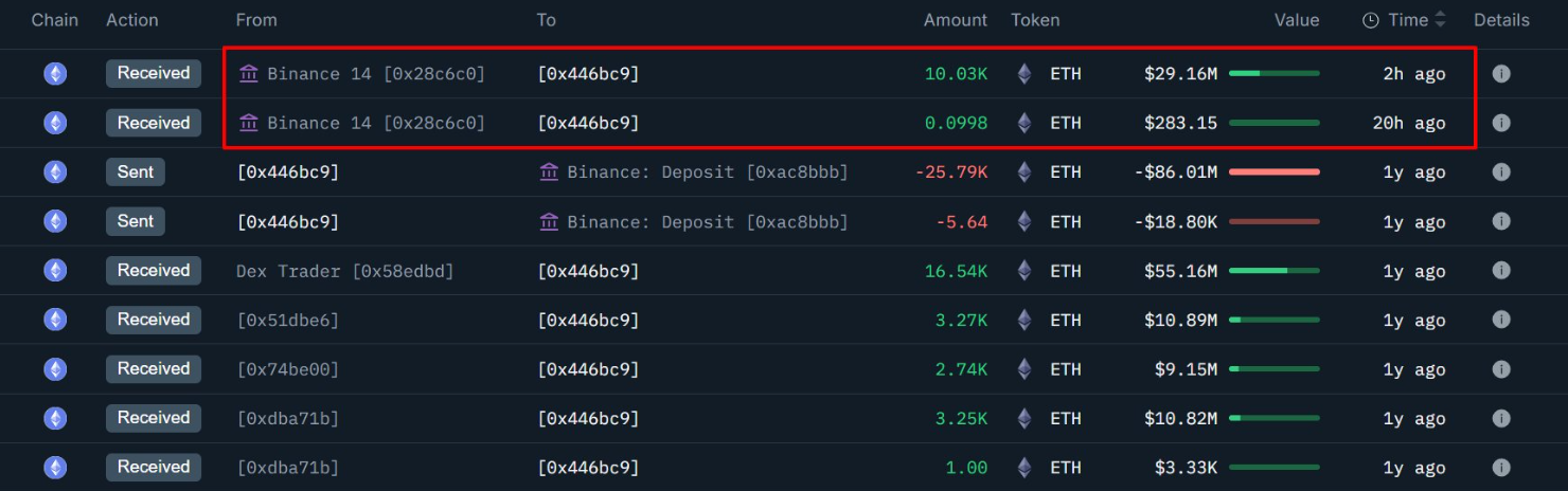 Theo dữ liệu từ nền tảng theo dõi giao dịch blockchain Onchain Lens, một “whale” tiền điện tử sử dụng ví 0x446 vừa bất ngờ rút 10.026 ETH — trị giá khoảng 29,16 triệu USD — từ Binance sau hơn một năm hoàn toàn không hoạt động.