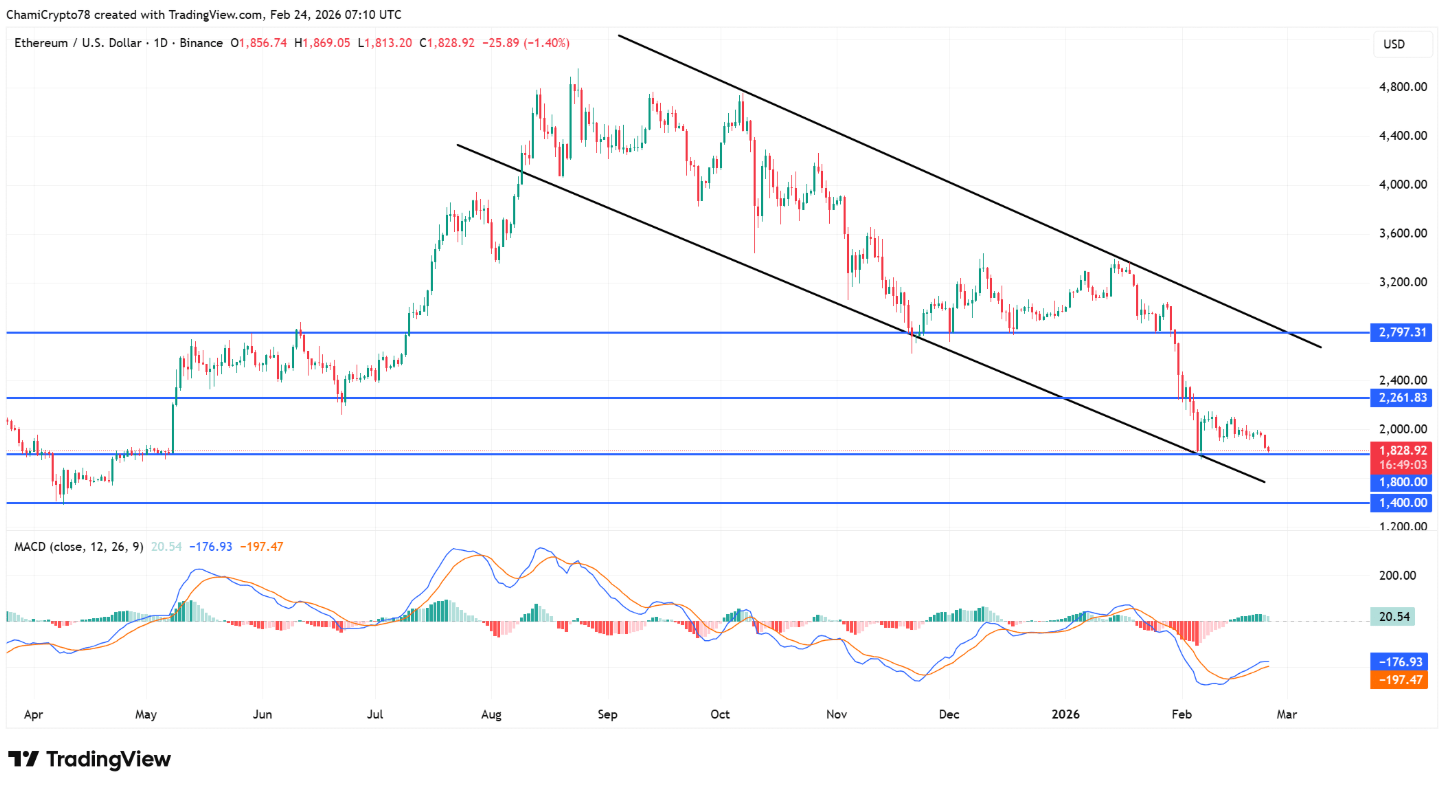 Việc giá lần lượt xuyên thủng mốc 2.797 USD, sau đó đánh mất vùng hỗ trợ ngang quan trọng tại 2.261 USD, đã xác nhận sự tiếp diễn của cấu trúc giảm. Hiện tại, ETH đang giao dịch quanh 1.828 USD và trực tiếp kiểm tra vùng hỗ trợ then chốt tại 1.800 USD — được xem là tuyến phòng thủ ngang cuối cùng trước khi bức tranh kỹ thuật chuyển sang tiêu cực hơn.