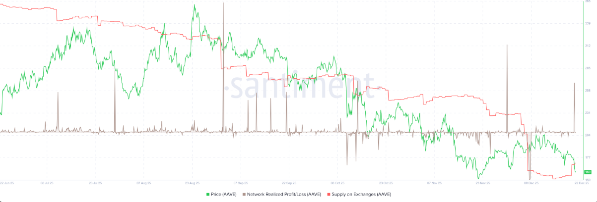 Giá Aave (AAVE) đã không thể vượt qua đường EMA 50 ngày tại mốc 193,61 USD trong phiên 10/12, qua đó đảo chiều giảm mạnh hơn 18% tính đến Chủ Nhật. Sang thứ Hai, áp lực bán vẫn chiếm ưu thế khi AAVE tiếp tục suy yếu và giao dịch dưới ngưỡng 161 USD.