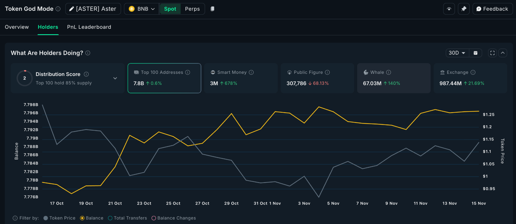 Token tiếp theo lọt vào “tầm ngắm” của các cá voi là Aster (ASTER), với tốc độ tích lũy nhanh chóng vượt trội so với Optimism. Trong vòng 30 ngày qua, các cá voi đã tăng nắm giữ lên 140%, đưa tổng lượng ASTER họ sở hữu lên 67,03 triệu token.