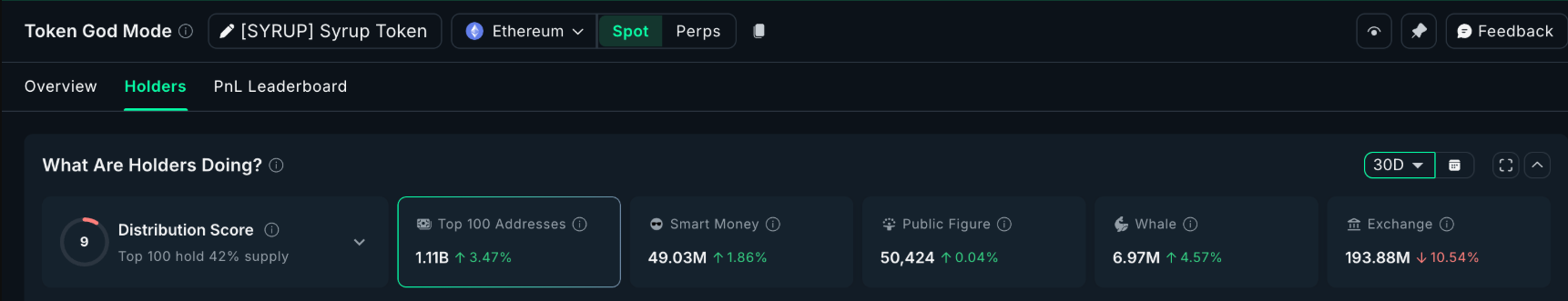 Trong 30 ngày qua, 100 địa chỉ mega-whale hàng đầu đã tăng nắm giữ SYRUP thêm 3,47%, nâng tổng lượng token lên 1,11 tỷ SYRUP. Với mức giá hiện tại, tổng lượng nắm giữ của các mega-whale trị giá khoảng 499,5 triệu USD, trong khi các nhóm holder khác cũng có xu hướng mua vào tương tự.