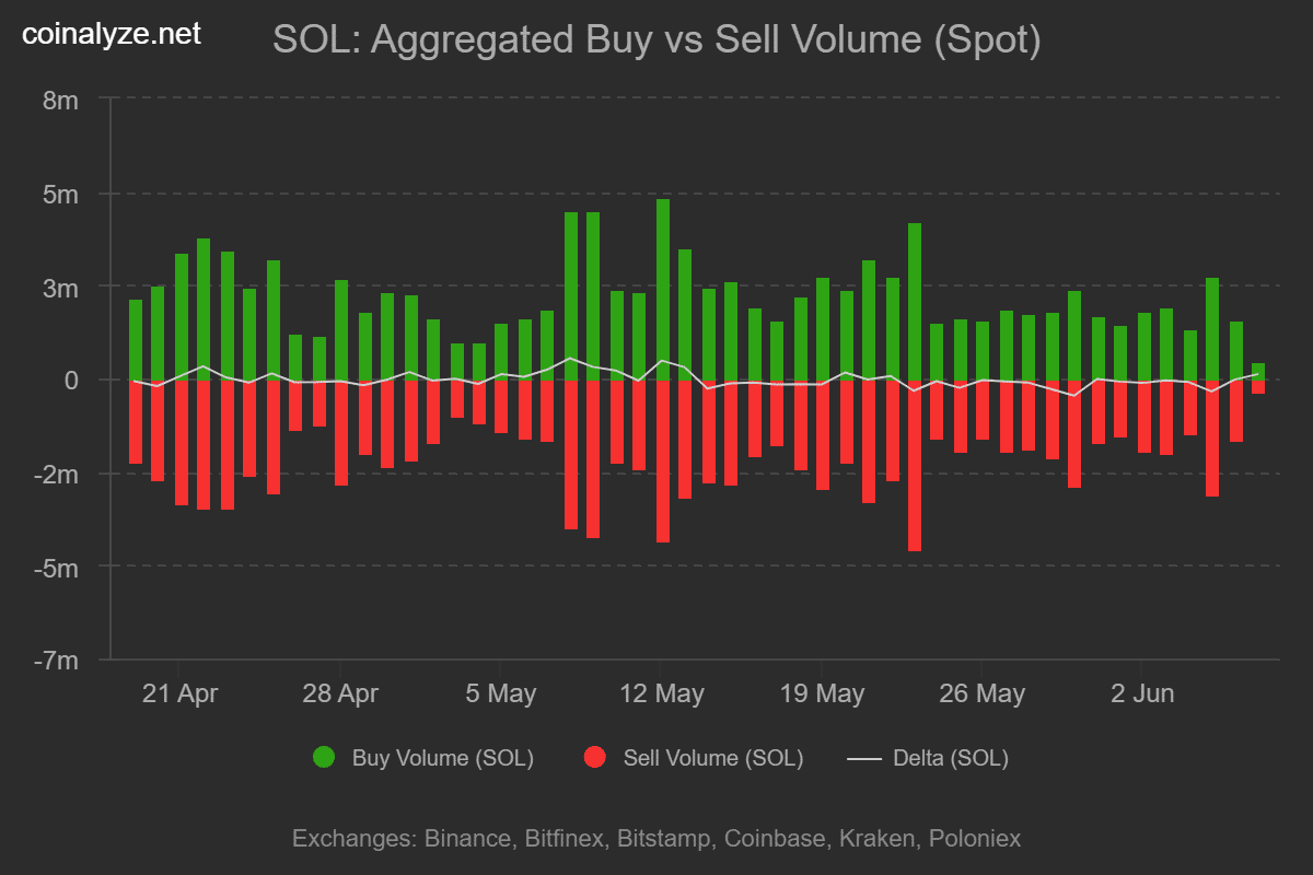 Theo Coinalyze, người mua đã gom 479.000 SOL trên thị trường giao ngay, với chênh lệch dương là 113.000, cho thấy nhu cầu rõ ràng đang vượt xa nguồn cung.