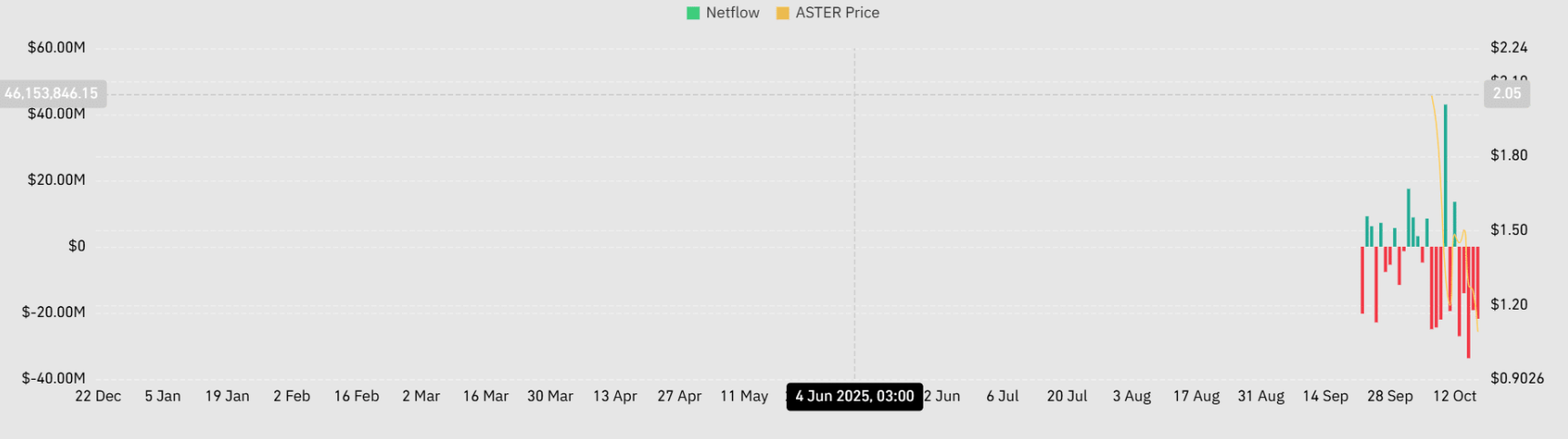 Dữ liệu từ CoinGlass cho thấy, Aster đã ghi nhận dòng vốn ròng âm trên thị trường spot suốt năm ngày liên tiếp. Tính đến thời điểm viết bài, Netflow giảm xuống còn -22,04 triệu USD – phản ánh lượng token rút khỏi sàn đang tăng mạnh.