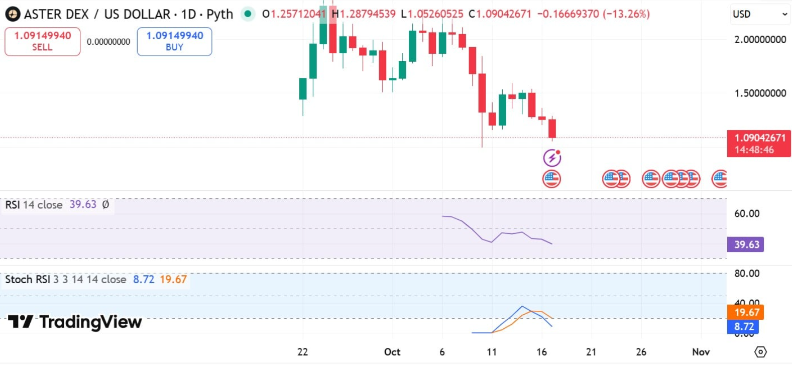Sau khi bị từ chối mạnh tại ngưỡng 1,5 USD, Aster (ASTER) đã trải qua ba ngày liên tiếp lao dốc, chạm đáy ở mức 1,05 USD. Tính đến thời điểm viết bài, đồng coin này đang được giao dịch quanh 1,09 USD, ghi nhận mức giảm sâu 16,83% chỉ trong vòng 24 giờ.