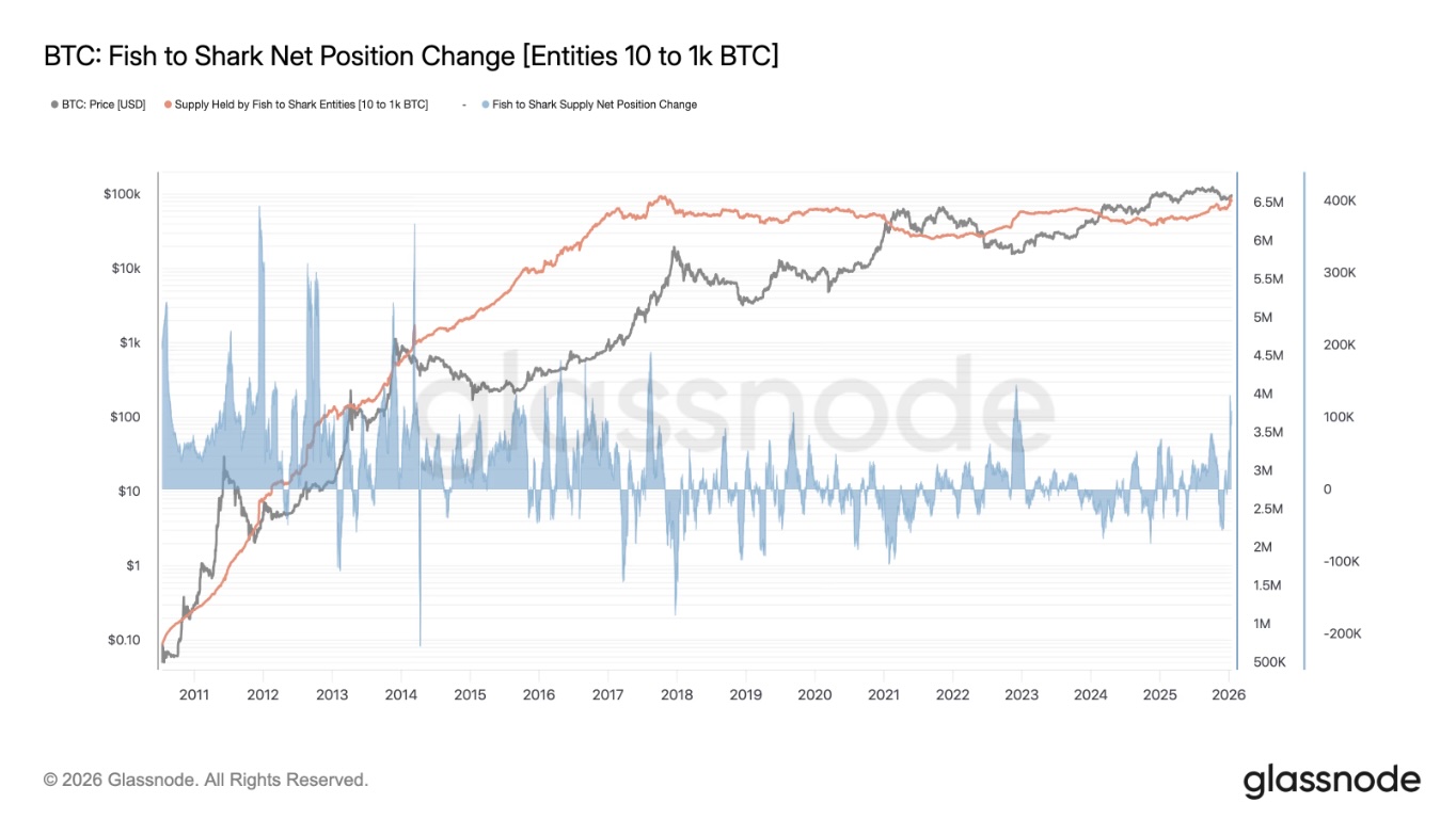 Theo dữ liệu từ Glassnode, trong 30 ngày qua, các thực thể nắm giữ từ 10 đến 1.000 BTC — thường được gọi là nhóm Fish-to-Shark — đã tích lũy khoảng 110.000 BTC. Đây là mức gia tăng lớn nhất của nhóm này kể từ thời điểm bitcoin lao dốc về vùng 15.000 USD cách đây hơn ba năm.