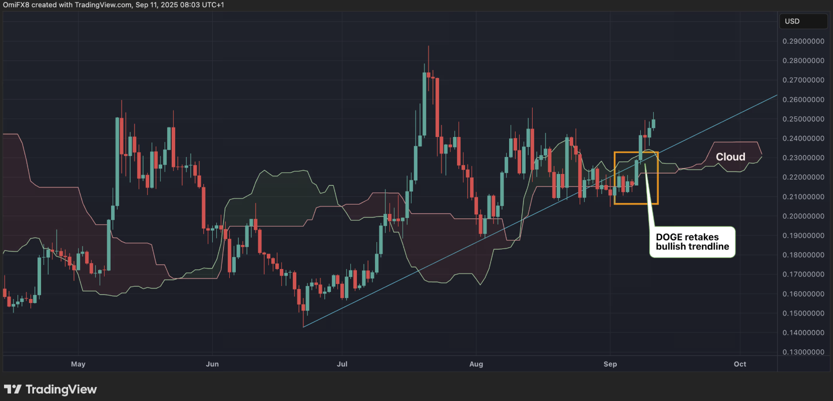 Trong khi đó, Dogecoin lại mang đến câu chuyện trái ngược. Sau giai đoạn điều chỉnh, DOGE đã lấy lại được đường xu hướng tăng hình thành từ đáy tháng 6, khiến phe bán rơi vào thế bị động. Đồng thời, giá DOGE cũng đã bứt phá lên trên Ichimoku cloud, một tín hiệu quan trọng củng cố khả năng giá tiếp tục phục hồi. Với đà hiện tại, DOGE có thể tiến tới kiểm định lại vùng đỉnh tháng 7 ở 0,28 USD.