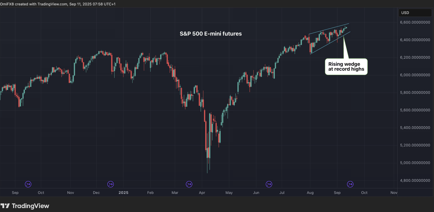 Kể từ ngày 1/8, hợp đồng tương lai S&P 500 E-Mini đã tăng gần 5% và thiết lập đỉnh kỷ lục mới tại 6.542 USD. Tuy nhiên, thay vì củng cố niềm tin vào xu hướng tăng, đà leo dốc này lại hình thành mô hình nêm tăng – một tín hiệu kỹ thuật thường được xem là dấu hiệu cảnh báo đảo chiều giảm giá.