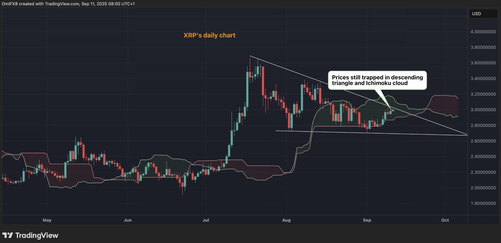 Cụ thể, XRP hiện vẫn đang nằm trong mô hình tam giác giảm dần, đồng thời tiếp tục di chuyển trong vùng Ichimoku cloud – vốn được coi là khu vực “nhiễu động” thể hiện sự thiếu chắc chắn về xu hướng. Sự kết hợp của hai yếu tố này cho thấy thị trường XRP đang ở trong giai đoạn tích lũy và lưỡng lự, khi cả phe mua lẫn phe bán đều chưa thể tạo ra cú bứt phá dứt khoát.