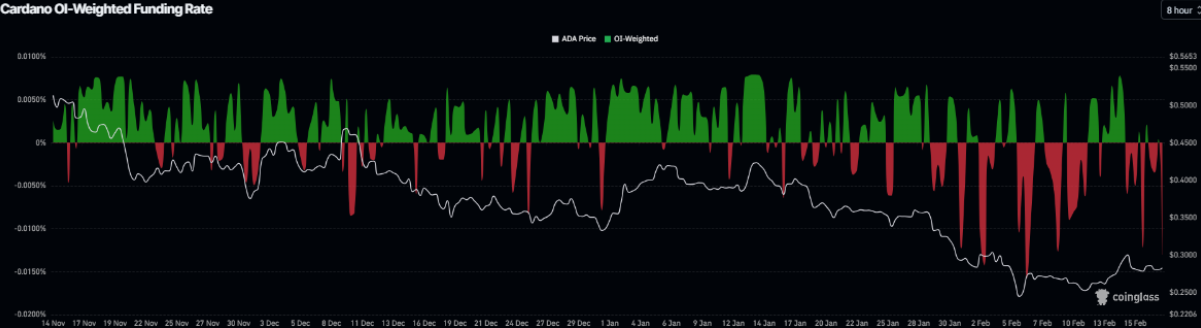 Không chỉ vậy, chỉ số OI-Weighted Funding Rate do Coinglass cung cấp cũng phát đi tín hiệu bi quan khi cho thấy số lượng trader đặt cược vào kịch bản giá Cardano giảm đang áp đảo so với phe kỳ vọng tăng giá. Chỉ số này đã chuyển sang vùng âm kể từ thứ Tư và hiện ở mức -0,0130%, tiệm cận mức ghi nhận vào ngày 6/2 — thời điểm ADA chứng kiến một đợt lao dốc mạnh. Funding rate âm đồng nghĩa với việc phe bán (short) đang phải trả phí cho phe mua (long), qua đó phản ánh tâm lý thận trọng và xu hướng tiêu cực đang bao trùm thị trường ADA.