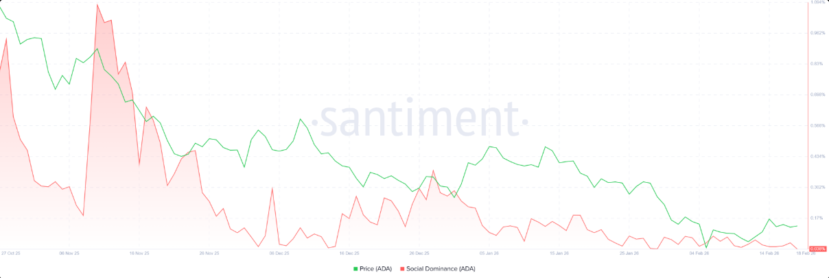 Trái ngược với tín hiệu này, chỉ số Social Dominance của Santiment đối với Cardano lại phát đi cảnh báo kém lạc quan. Chỉ số phản ánh tỷ trọng thảo luận về ADA trên các kênh truyền thông tiền điện tử đã suy giảm liên tục từ cuối tháng 12 và tiếp tục rơi mạnh vào đầu tháng 2, chạm mức 0,038% vào thứ Tư. Điều đó cho thấy sự chú ý của thị trường đang dần nguội lạnh, kéo theo tâm lý nhà đầu tư ADA ngày càng thận trọng.