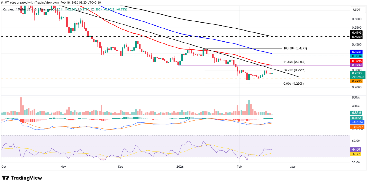 Giá Cardano đã vấp phải áp lực bán mạnh tại ngưỡng Fibonacci thoái lui 38,2% ở vùng 0,29 USD — được xác định từ đỉnh ngày 14/1 tại 0,42 USD xuống đáy ngày 6/2 ở 0,22 USD. Đà từ chối này khiến ADA quay đầu giảm 4,47% ngay trong phiên Chủ nhật. Trong hai phiên gần nhất, giá chủ yếu đi ngang quanh mốc 0,28 USD và đến thứ Tư vẫn chưa cho thấy dấu hiệu bứt phá rõ ràng khỏi vùng tích lũy này.