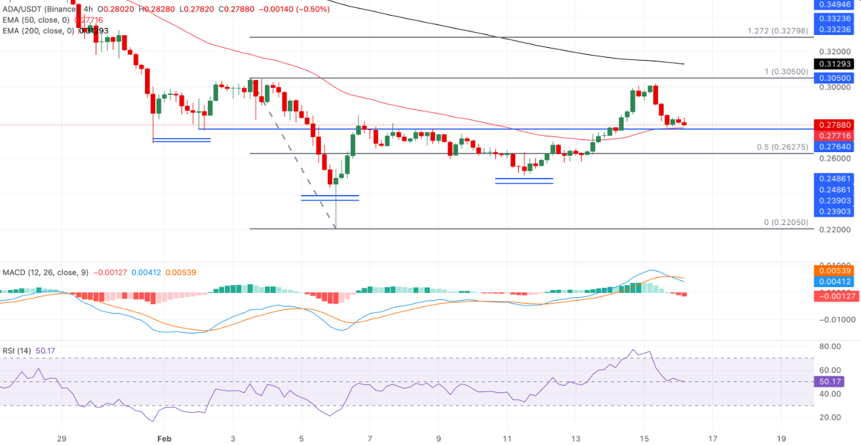 Trong kịch bản tiêu cực, nếu ADA đánh mất mốc 0,2772 USD, giá có khả năng lùi về kiểm tra mức Fibonacci thoái lui 50% tại 0,2669 USD. Mức này được xác định từ đỉnh ngày 3/2 ở 0,3050 USD đến đáy ngày 6/2 tại 0,2289 USD và được xem là vùng hỗ trợ quan trọng tiếp theo.
