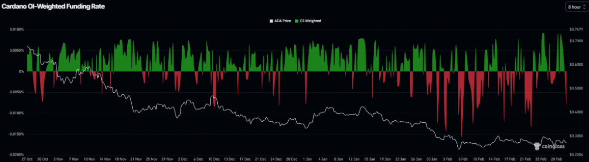 Trên thị trường phái sinh, dữ liệu funding rate từ CoinGlass tiếp tục phát đi tín hiệu tiêu cực. Chỉ số này đảo chiều sang mức âm từ thứ Hai và duy trì ở -0,009% trong ngày thứ Ba, cho thấy phe bán khống (short) đang phải trả phí cho phe mua (long). Diễn biến này phản ánh tâm lý bi quan đang chiếm ưu thế đối với ADA.